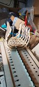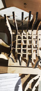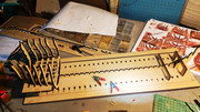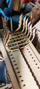 Κούμπωσε λοιπόν η μονοκόμματη καρίνα στο ειδικό πλαίσιο, σταθεροποιήθηκε και άρχισα να φτιάχνω τα κάθετα πλαίσια με την βοήθεια των σχεδίων σαν οδηγό, ώστε να μην ξεφύγω από το σχήμα. Τρία κομμάτια για κάθε ένα από τα 32 πλαίσια. Μέσα μπαίνουν οι τραβέρσες για να δημιουργήσουν το χαμηλότερο κατάστρωμα και ισχυροποιείται η δομή. Τέσσερα καταστρώματα θα γίνουν με αυτόν τον τρόπο. Σταδιακά λοιπόν από την πλώρη προς την πρύμνη, προχωράω την τοποθέτηση των κάθετων πλαισίων που είναι αριθμημένα, για να μην γίνει κάποιο λάθος.