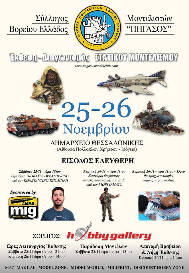 Όπως κάθε χρόνο, έτσι και φέτος, ο Σύλλογος Μοντελιστών Βορείου Ελλάδος "ΠΗΓΑΣΟΣ" διοργανώνει την ετήσια έκθεση του στις 25 - 26 Νοεμβρίου 2017, στο Δημαρχείο Θεσσαλονίκης!