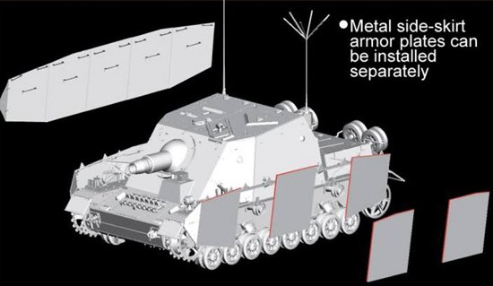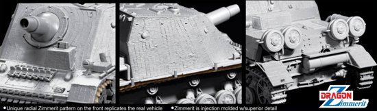 Να σημειωθεί ότι τα κομμάτια των υπερκατασκευών είναι μονοκόμματα, ενώ σύμφωνα με τις φωτογραφίες που έχει δημοσιοποιήσει η Dragon, η υφή και το pattern της Zimmerit, είναι πολύ όμορφες. Το κιτ περιλαμβάνει ερπύστριες DS, ενώ ένα ακόμη χαρακτηριστικό της νέας αυτής κυκλοφορίας, που αποτελείται από 100% νέα καλούπια, είναι λεπτομέρειες όπως οι ραβδώσεις της κάννης του πυροβόλου.