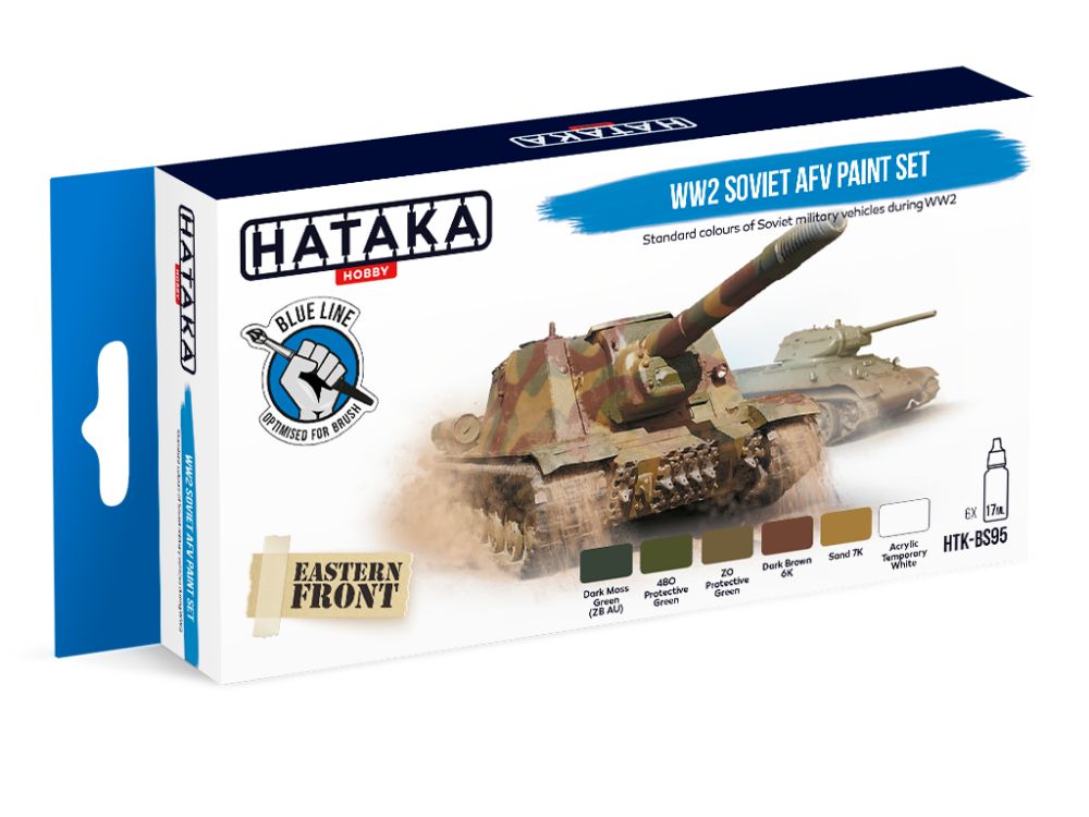 HTK-BS95 WW2 Soviet AFV paint set, στην μπλε σειρά ακρυλικών, υδατοδιαλυτών χρωμάτων, για χρήση με πινέλο. Περιλαμβάνει τα χρώματα: