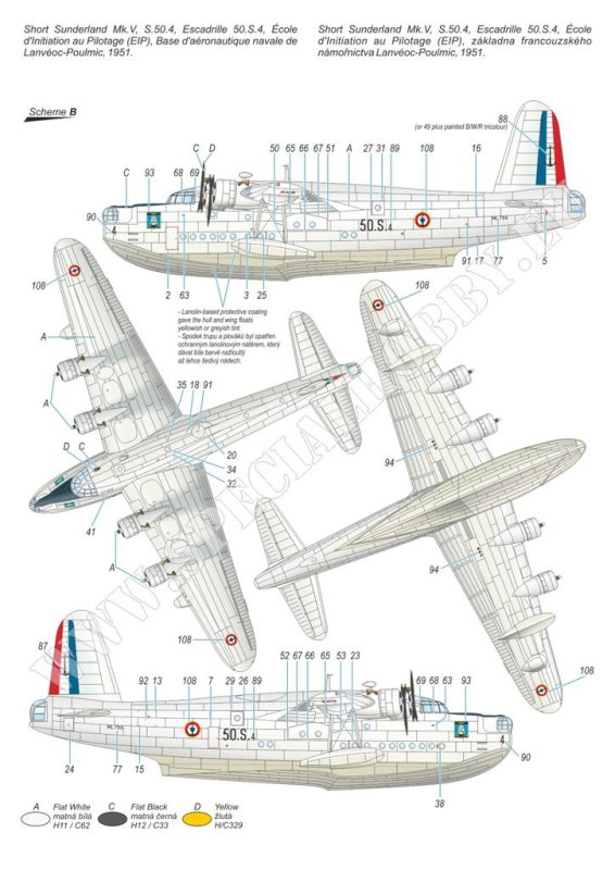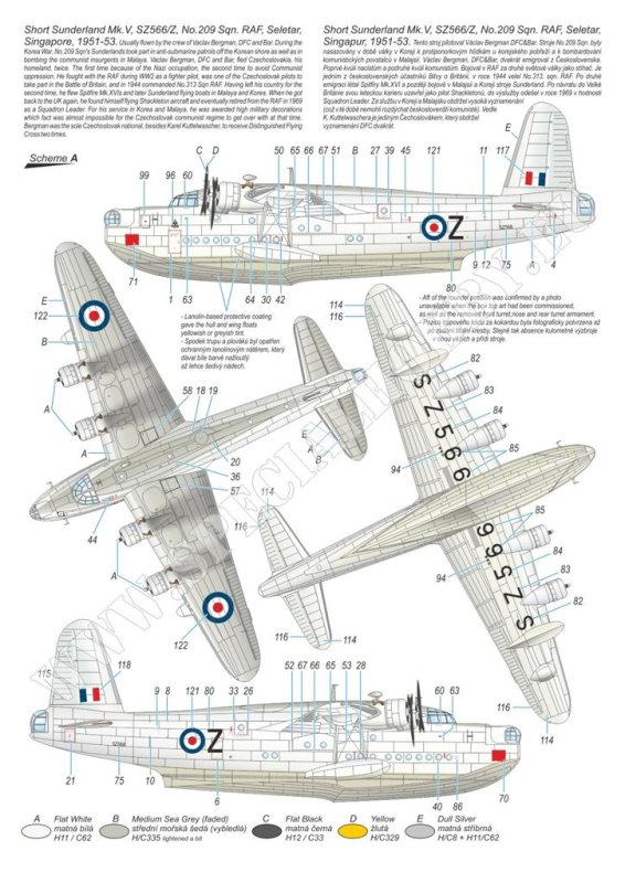 Περιέχονται σήματα για τρία βρετανικά (RAF) και ένα γαλλικό αεροσκάφος (Aéronavale), όλα μεταπολεμικά Mk V (1948-53), με κυρίαρχο το λευκό και το Medium Sea Grey στις εξωτερικές επιφάνειες. Οσοι θα προτιμούσαν ένα Sunderland που έδρασε κατά τον B' ΠΠ (Μk I, II, III, IV) θα πρέπει να περιμένουν τις επόμενες εκδόσεις της Special Hobby, μια και υπήρχαν ορισμένες εξωτερικές και εσωτερικές διαφορές.