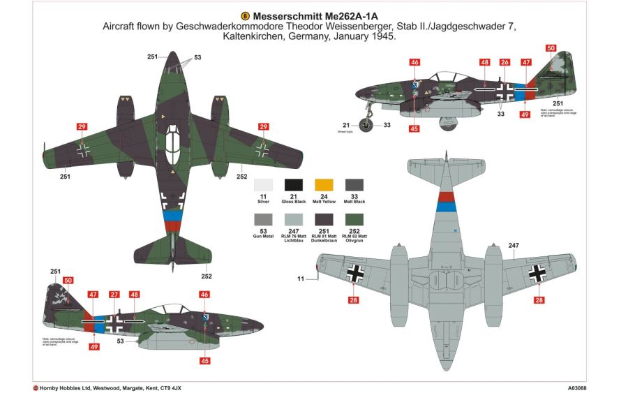- Messerschmitt Me262A-1A «Πράσινο 4» WNr.111002, Geschwaderkommodore Theodor Weissenberger, Stab II./Jagdgeschwader 7, στο Kaltenkirchen της Γερμανίας τον Ιανουάριο του 1945.