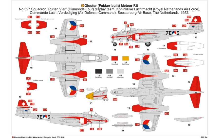 - Gloster Meteor F.8 (Fokker built) 7E-5, No.327 Squadron Koninklijke Luchtmacht (Royal Netherlands Air Force) ‘Ruiten Vier’ (Diamonds Four) display team, Commando Lucht Verdediging (Air Defence Command), Soesterberg Air Base, Netherlands 1952.