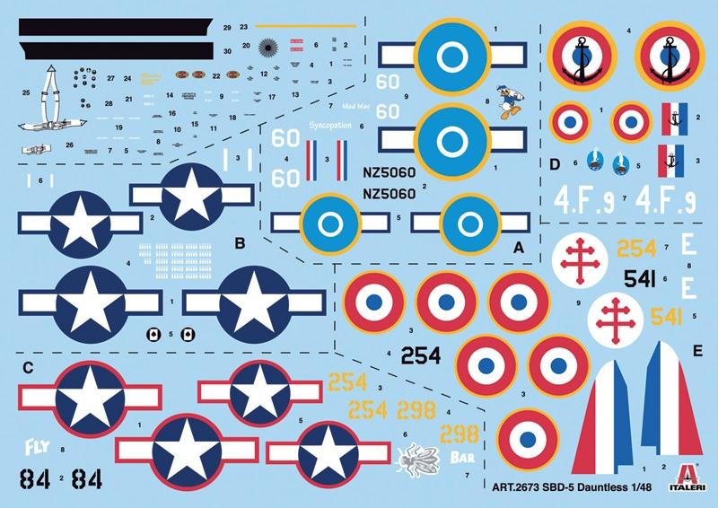 - 2673 SBD-5 DAUNTLESS στην 1/48 με χαλκομανίες για αεροσκάφη του Αμερικανικού πολεμικού Ναυτικού, του Γαλλικού Ναυτικού (και στην Ινδοκίνα), αλλά και της Νεοζηλανδικής αεροπορίας. (Λεπτομέρειες εδώ)