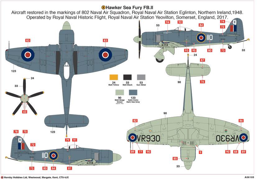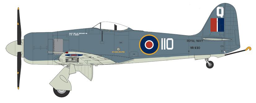 Το Hawker Sea Fury FB.II, με κωδικό VR930, 110/Q, το οποίο έχει αναπαλαιωθεί με τα σήματα της 802 μοίρας Ναυτικής Συνεργασίας, στην βάση RNAS Eglinton στην Β. Ιρλανδία το 1948. Το αεροσκάφος πετά από την «Royal Naval Historic Flight» στην βάση , RNAS Yeovilton στο Somerset, το 2017.
