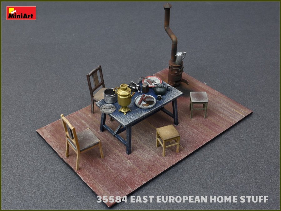 - Το σετ «European Home Stuff», περιλαμβάνει οικιακά είδη, που συναντώνται σε ένα μέσο σπίτι της κεντρικής και Ανατολικής Ευρώπης. Τραπέζι, καρέκλες, πιάτα, μαχαιροπίρουνα, ποτήρια και κύπελλα, σιδερο σιδερώματος, κηροπήγια, αλλά και μια στόφα είναι μερικά μόνο από τα περιεχόμενα του σετ, το οποίο εκτός από τα πλαστικά κομμάτια, περιλαμβάνει και φωτοχαραγμένα.