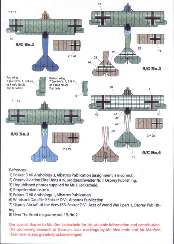 - 2. Fokker D.VII (κατασκευασμένο από την Fokker σε κάποια από τις αρχικές παρτίδες παραγωγής) με άγνωστο πιλότο, Jasta 16b, αεροδρόμιο St. Margueritte, Ιούνιος/Ιούλιος 1918. Το αεροσκάφος έχει πιθανότατα προπέλα Axis και στα φέρει τηλεσκοπικό σκοπευτικό. Όντας ένα από τα πρώτα Fokker D.VII δεν φέρει κανένα άνοιγμα εξαερισμού γύρω από τον κινητήρα.