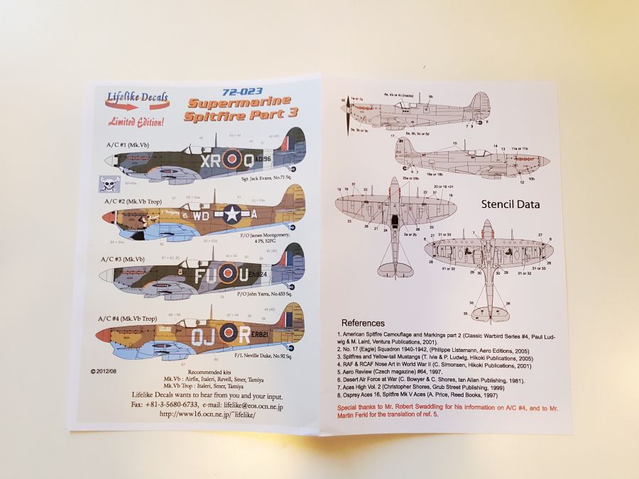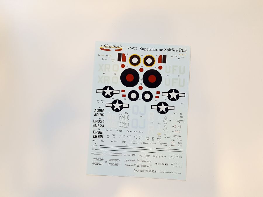 Ένα ακόμη σετ για Spitfires, το τρίτο της σειράς με τίτλο "Supermarine Spitfire Part 3" από την Lifelike Decals, αυτή τη φορά στην 1/72, μετά την κυκλοφορία στην 1/48. Κατά τη συνήθη πρακτική της, η Lifelike μας παρέχει πλήρη σήματα (συμπεριλαμβανομένων των προειδοποιητικών) για 4 αεροσκάφη.